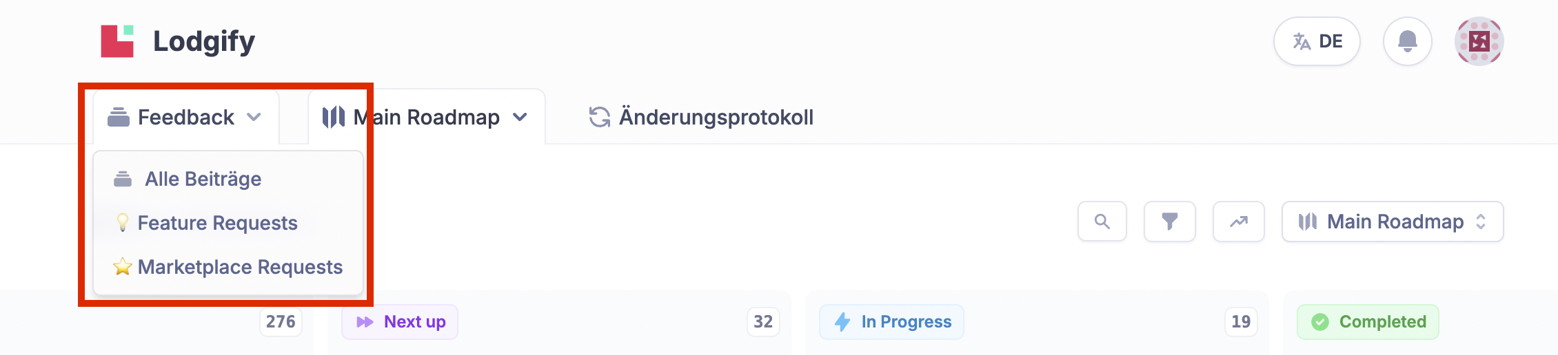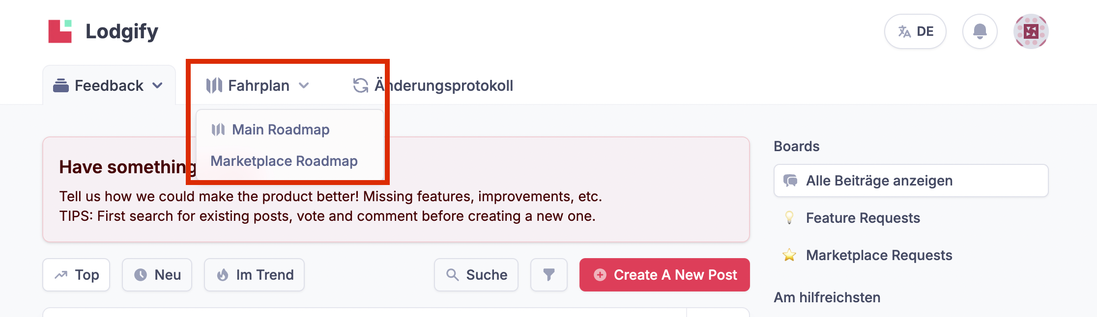 Gehen Sie zur Produkt-Roadmap von Lodgify, wählen Sie Fahrplan und entscheiden Sie, ob Sie die Haupt-Roadmap oder die Roadmap für die Marketplace-Apps sehen möchten.