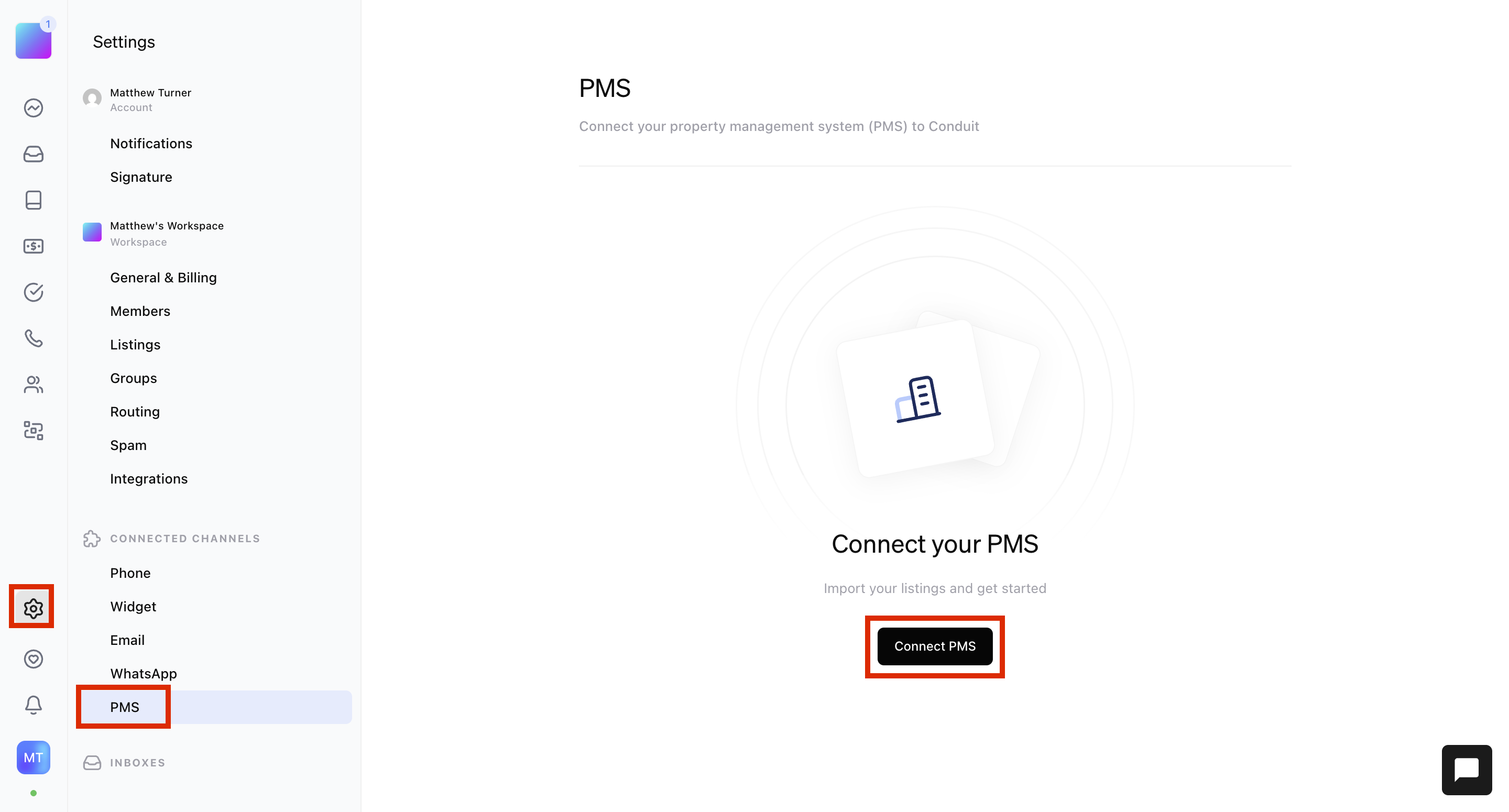 - Melden Sie sich in Ihrem Conduit-Konto an, navigieren Sie zum Tab Settings, wählen Sie PMS und klicken Sie auf Connect PMS: