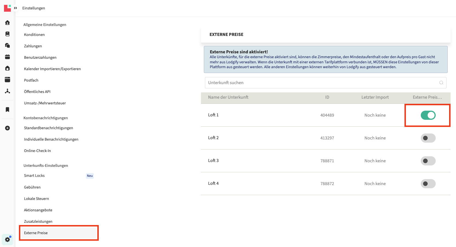 Wenn der Schalter für die Unterkunft aktiviert ist, bedeutet dies, dass externe Tarife verwendet werden.