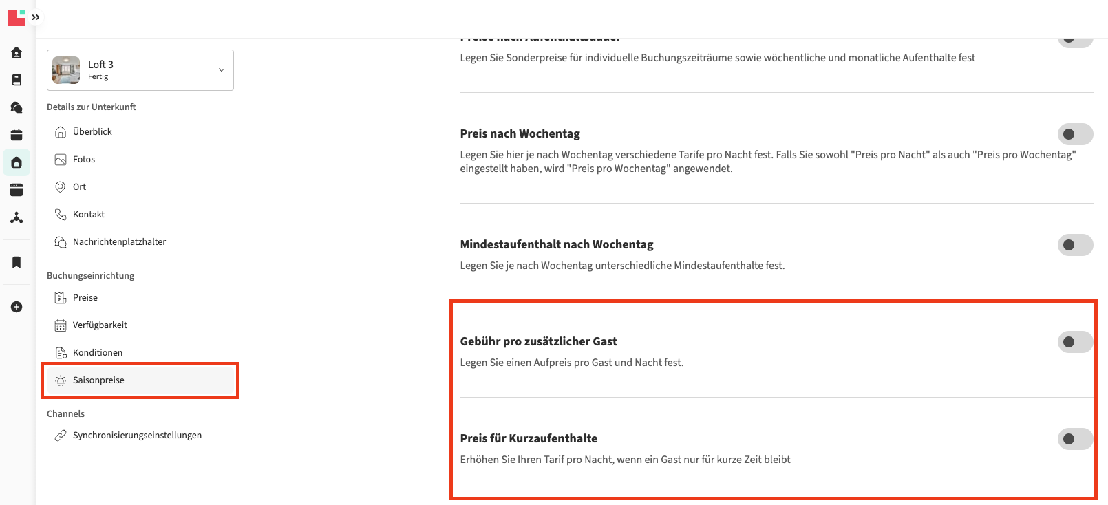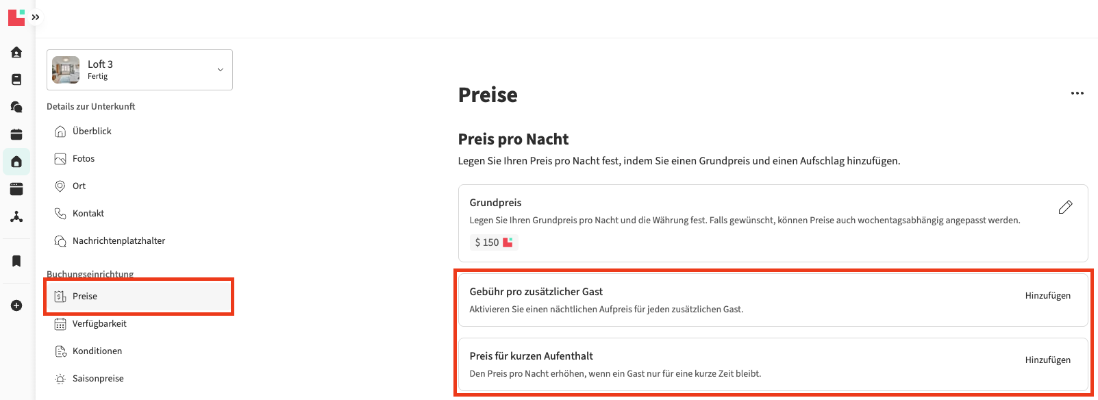 - Wenn nein: Prüfen Sie, ob die spezifische Einstellung im Bereich Preise Ihrer Unterkunft im Feld Grundpreis aktiviert ist.