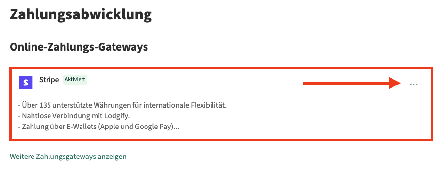 Klicken Sie auf die drei Punkte im Stripe-Abschnitt und wählen Sie Einstellungen.