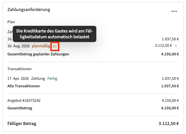 - Wenn die Option „Kreditkarte für alle nachfolgenden geplanten Anzahlungen automatisch belasten.“ angekreuzt ist, bedeutet dies, dass die Funktion aktiv ist.