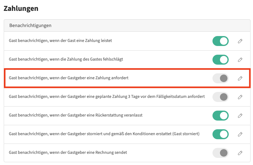 💡 Hinweis: Sie können den Inhalt der Benachrichtigung für die Zahlungsaufforderung im Abschnitt Benutzerdefinierte Benachrichtigungen Ihres Kontos bearbeiten/überprüfen. Klicken Sie auf das Bleistift-Symbol neben der Benachrichtigung "Gast benachrichtigen, wenn der Gastgeber eine Zahlung anfordert":