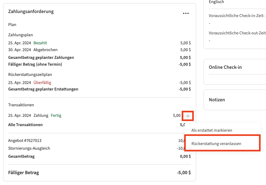 Wenn der Gast mit PayPal oder über manuelle Zahlungsmethoden bezahlt hat, müssen Sie die Rückerstattung extern abwickeln.