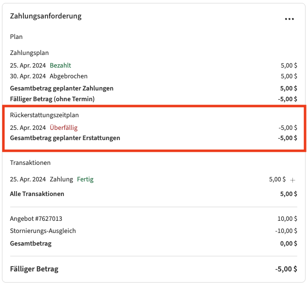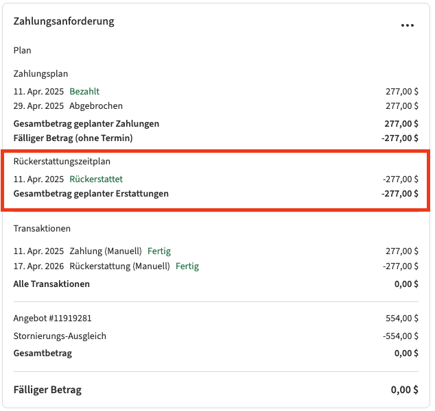 Wenn automatische Rückerstattungen nicht aktiviert sind, wird das System die Rückerstattung nicht von selbst bearbeiten. Stattdessen wird die Rückerstattung als Geplant markiert, und Sie müssen sie manuell veranlassen.