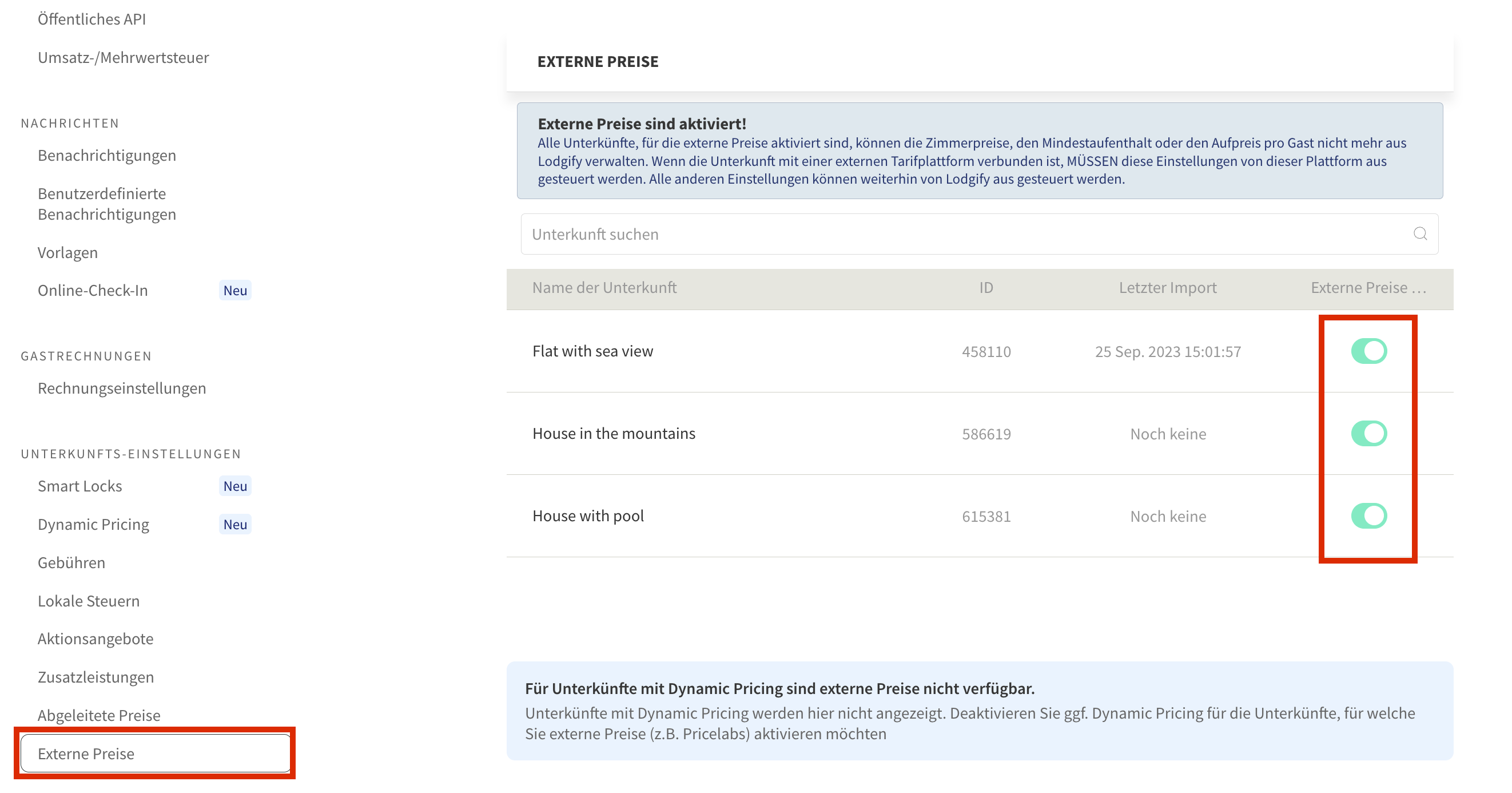 💡 Hinweis: Sobald Externe Preise für eine Unterkunft aktiviert sind, werden Preise und Mindestaufenthalt nicht mehr in Lodgify verwaltet.