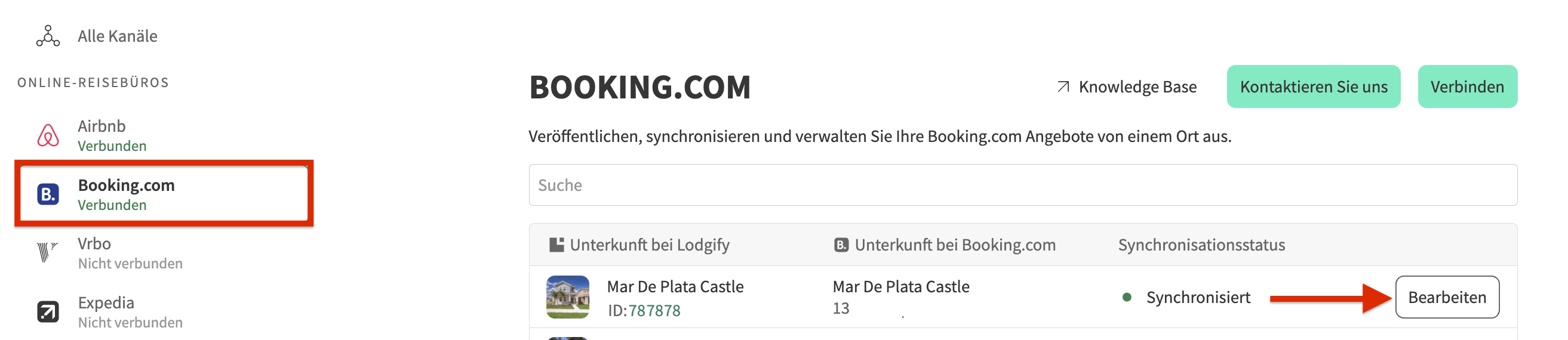 - Klicken Sie auf Booking.com und dann auf Bearbeiten bei der Unterkunft, die Sie verwalten möchten.