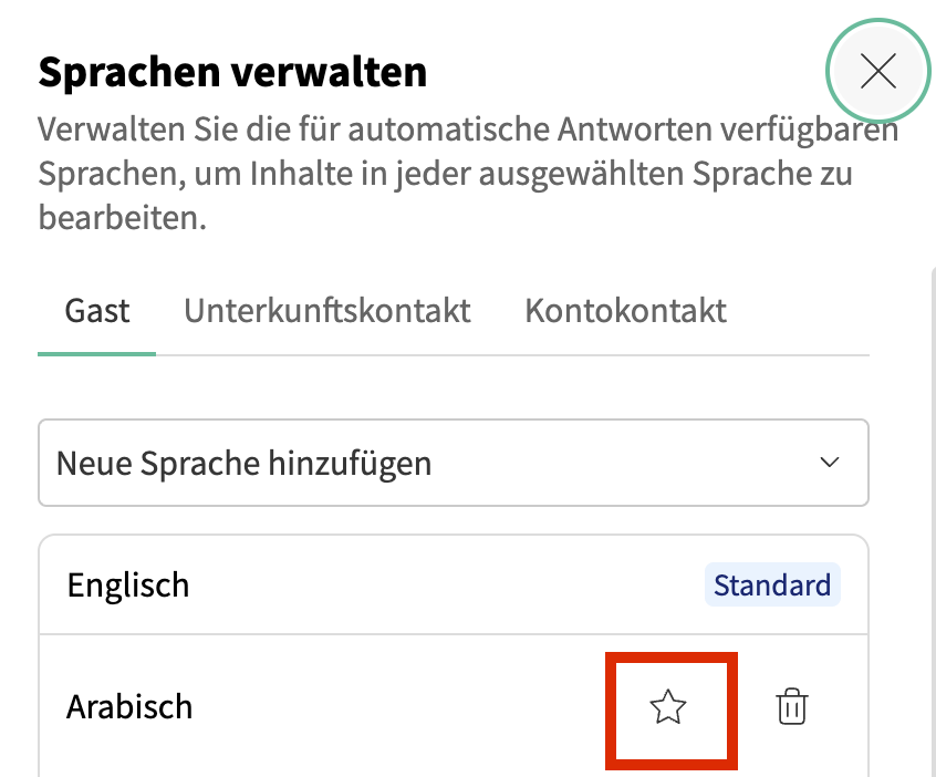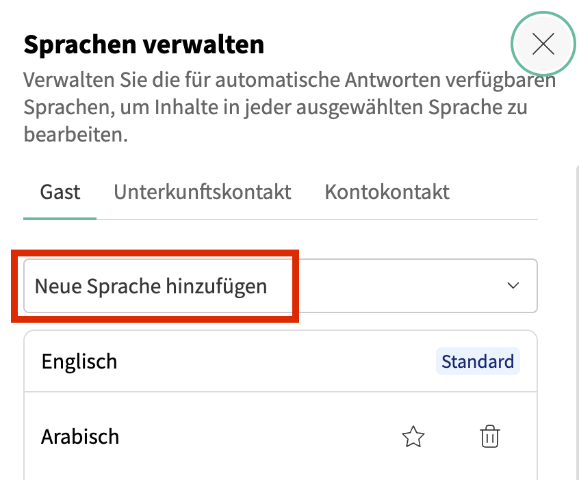 Für Gäste können Sie Sprachen hinzufügen, entfernen oder eine Standardsprache für automatische Antworten festlegen:- Um eine neue Sprache hinzuzufügen, klicken Sie auf Neue Sprache hinzufügen