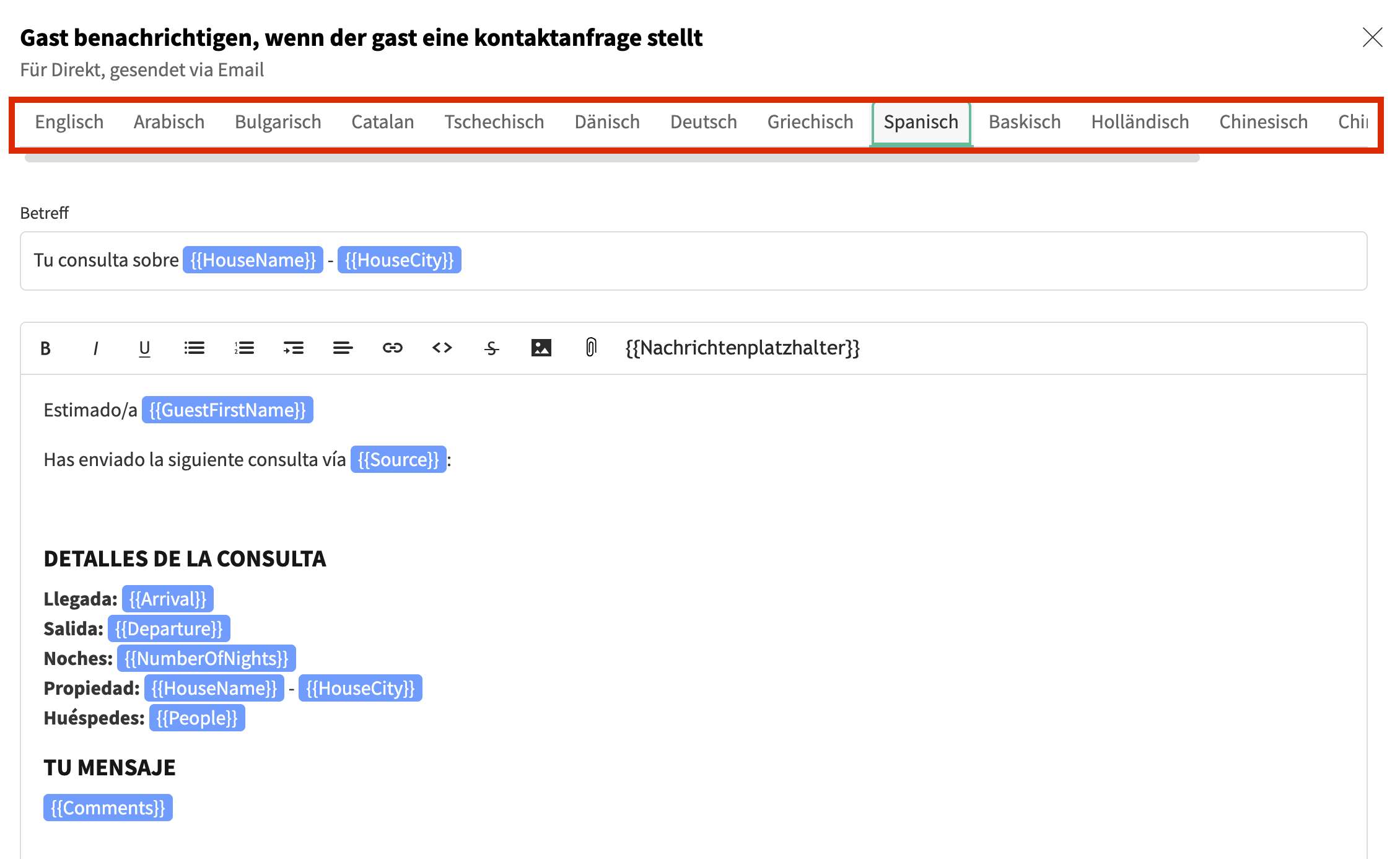 - Oben können Sie eine Sprache auswählen und dann den Betreff sowie den Inhalt der Nachricht in dieser Sprache anpassen: