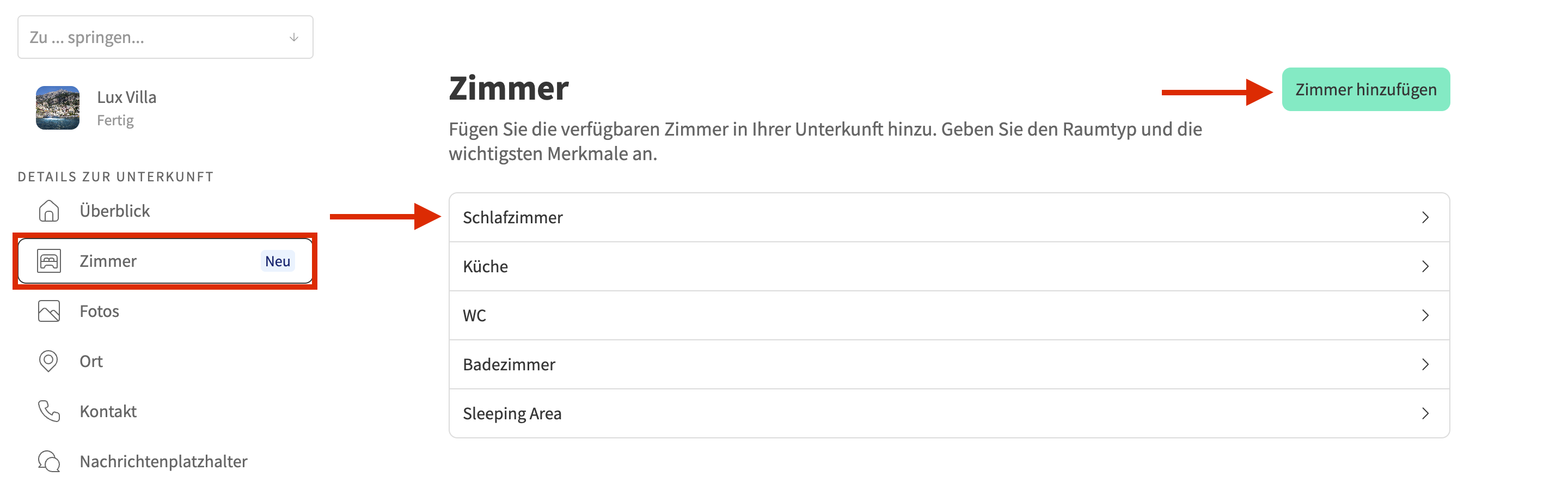 - Klicken Sie auf Zimmer hinzufügen, um ein neues Zimmer für Ihre Unterkunft zu erstellen, oder klicken Sie auf ein bestehendes Zimmer, um es zu bearbeiten.