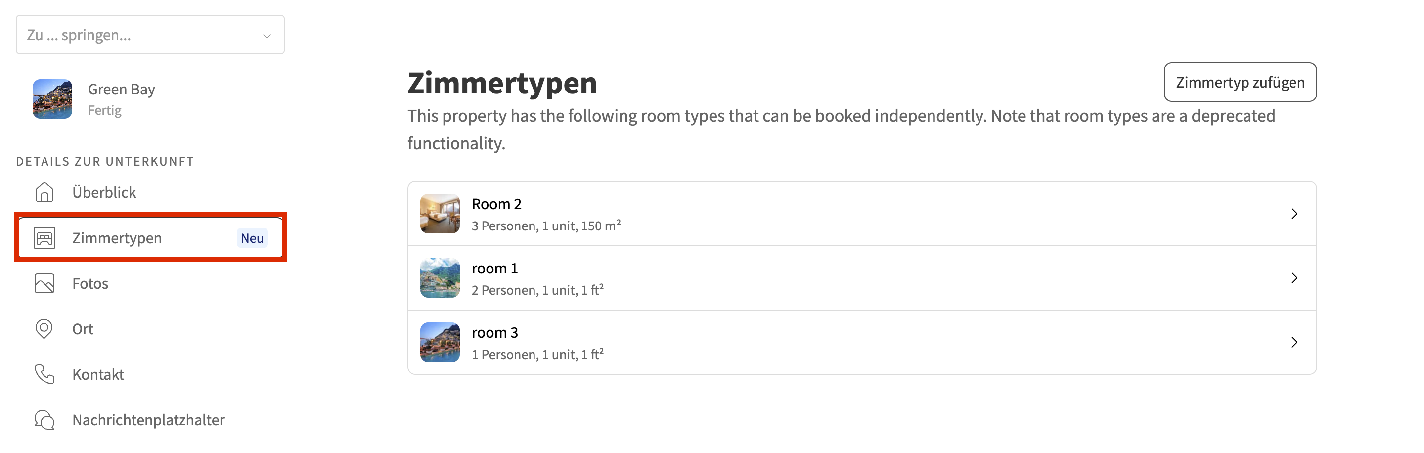 - Öffnen Sie Ihr Menü auf der linken Seite und wählen Sie Unterkünfte. Klicken Sie dann auf die Unterkunft, die Sie bearbeiten möchten, und gehen Sie zu Zimmertypen.