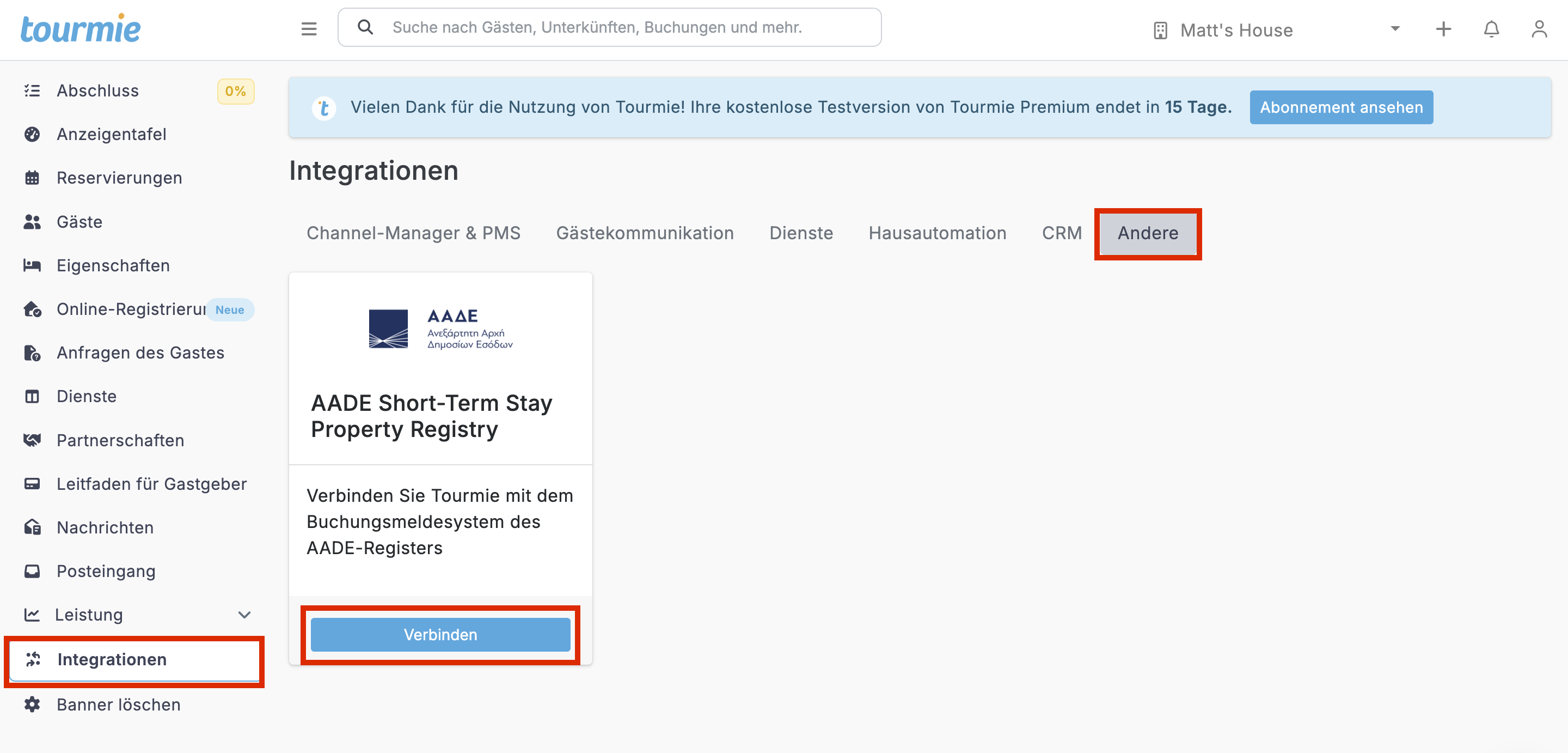Tourmie integriert sich mit ΑΑΔΕ, dem griechischen Register für Kurzzeitvermietungen, und ermöglicht es Ihnen, alle Buchungen und Buchungswerte direkt über die App an die Regierung zu übermitteln.