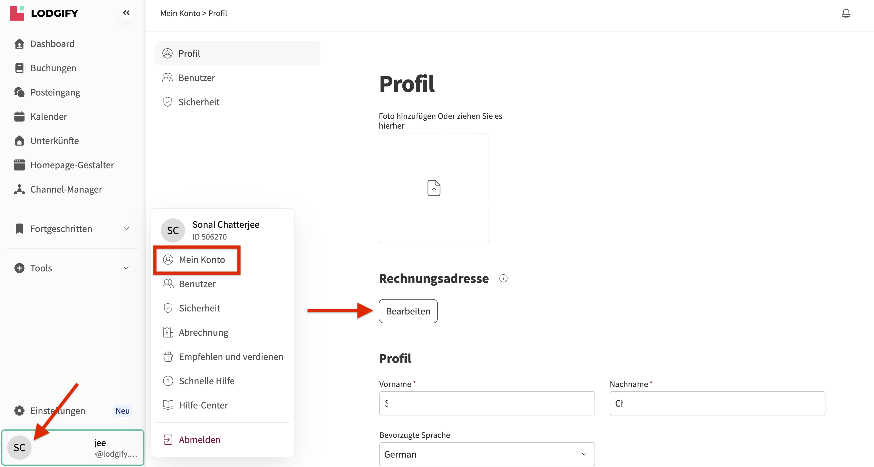 💡 Hinweis: Um diese E-Mail-Adresse zu finden, melden Sie sich in Ihrem Lodgify-Konto an, klicken Sie unten links auf Ihr Profil-Icon, wählen Sie Mein Konto – dort sehen Sie die E-Mail unter Rechnungsadresse.