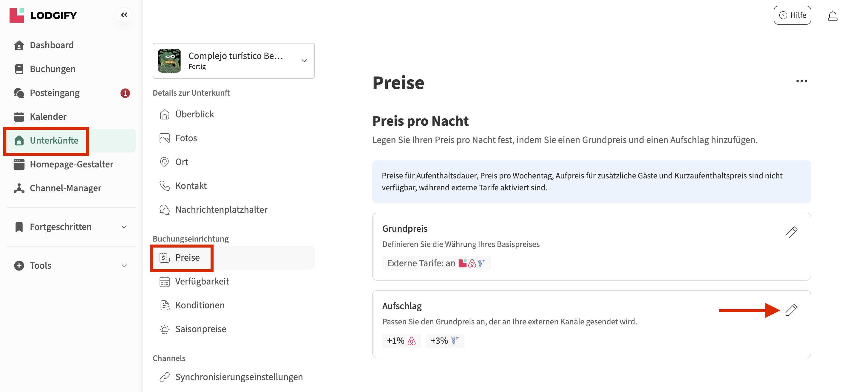- Wählen Sie die Unterkunft aus, für die Sie den Aufschlag anpassen möchten, gehen Sie dann zu Preise und klicken Sie auf das Stift-Symbol neben Aufschlag.
