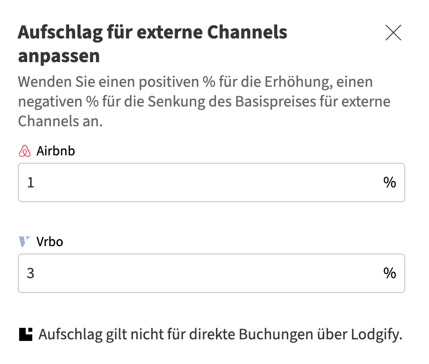 💡 Hinweis: Auf Direktbuchungen können Sie keinen Aufschlag anwenden. Legen Sie daher Ihre gewünschten Preise für Direktbuchungen direkt in Ihren Lodgify-Preisen fest. Verwenden Sie anschließend die Aufschlag-Funktion, um die an OTAs gesendeten Preise auf den verbundenen Plattformen zu erhöhen oder zu senken.