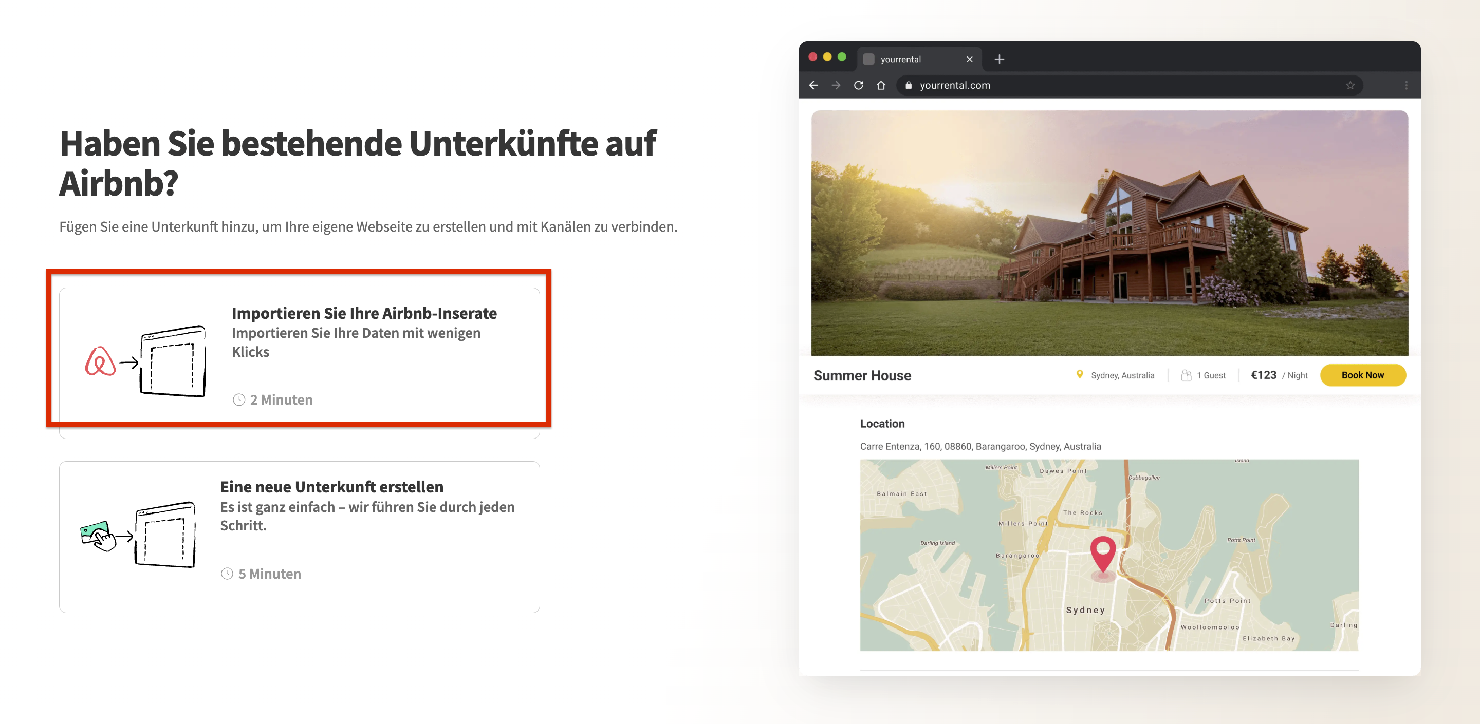 | Überschrift der Unterkunft | ✔️ | Da diese Information in Airbnb nicht existiert, importieren wir die ersten 120 Zeichen der Beschreibung der Unterkunft. Bitte überprüfen Sie dies sorgfältig. |