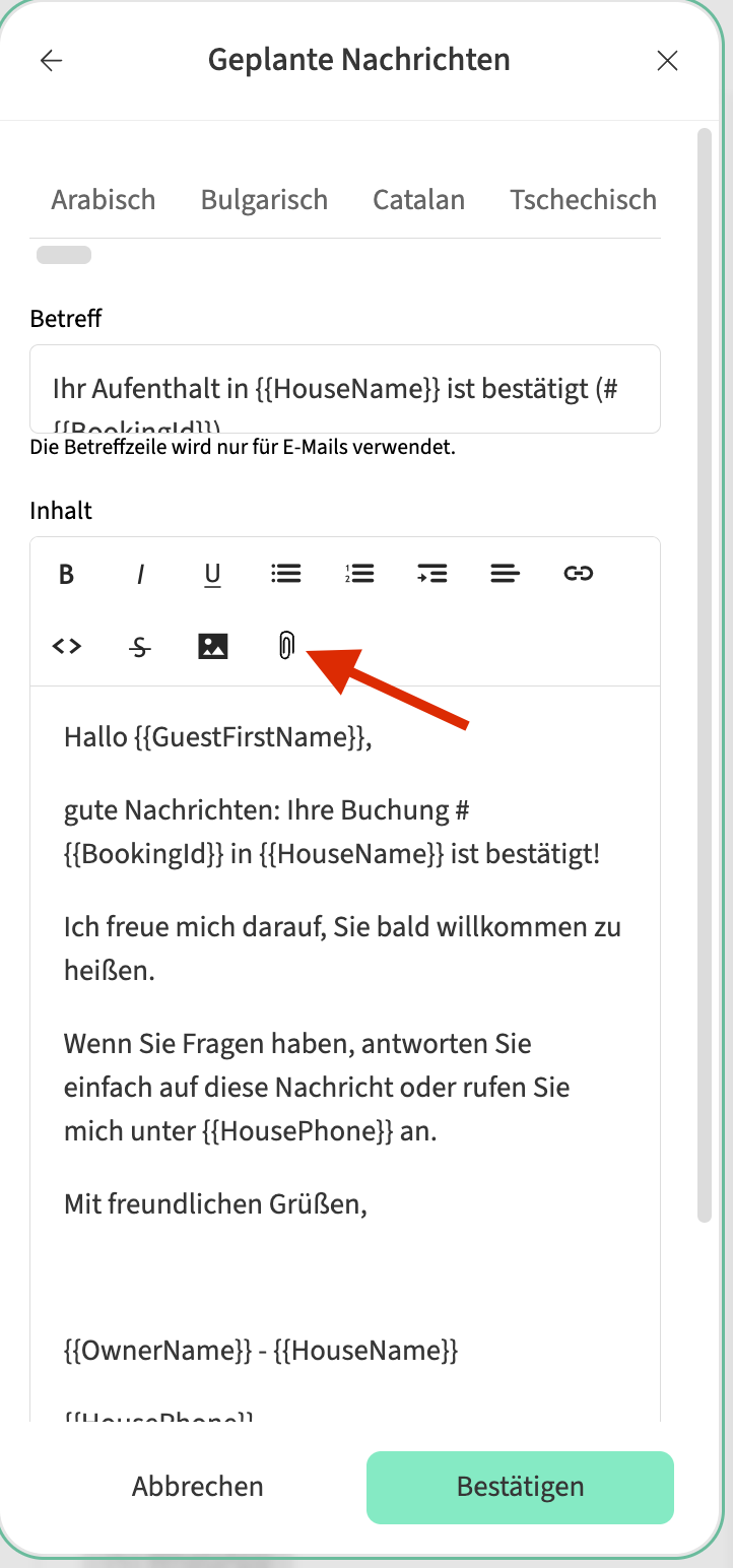 Um Dateien an automatische Benachrichtigungen für Unterkunfts- und Kontokontakte anzuhängen, folgen Sie diesen Schritten:
