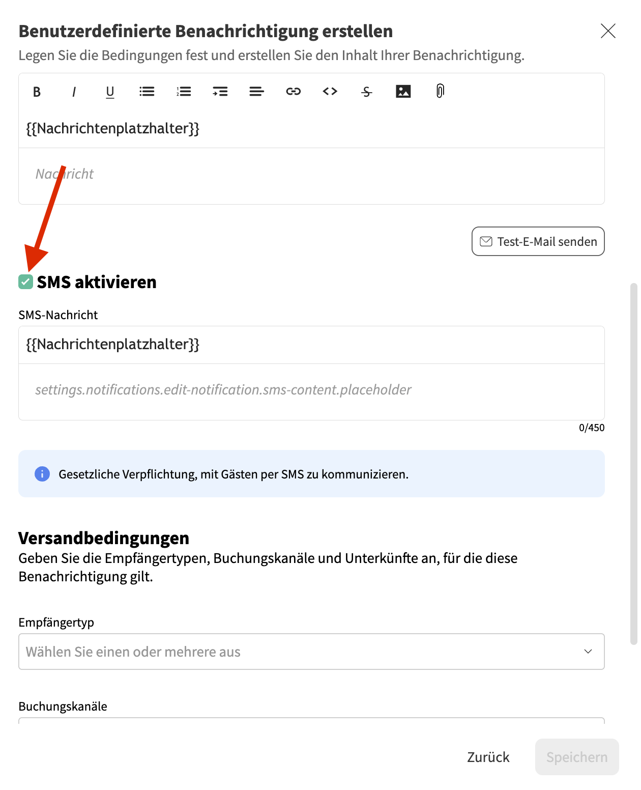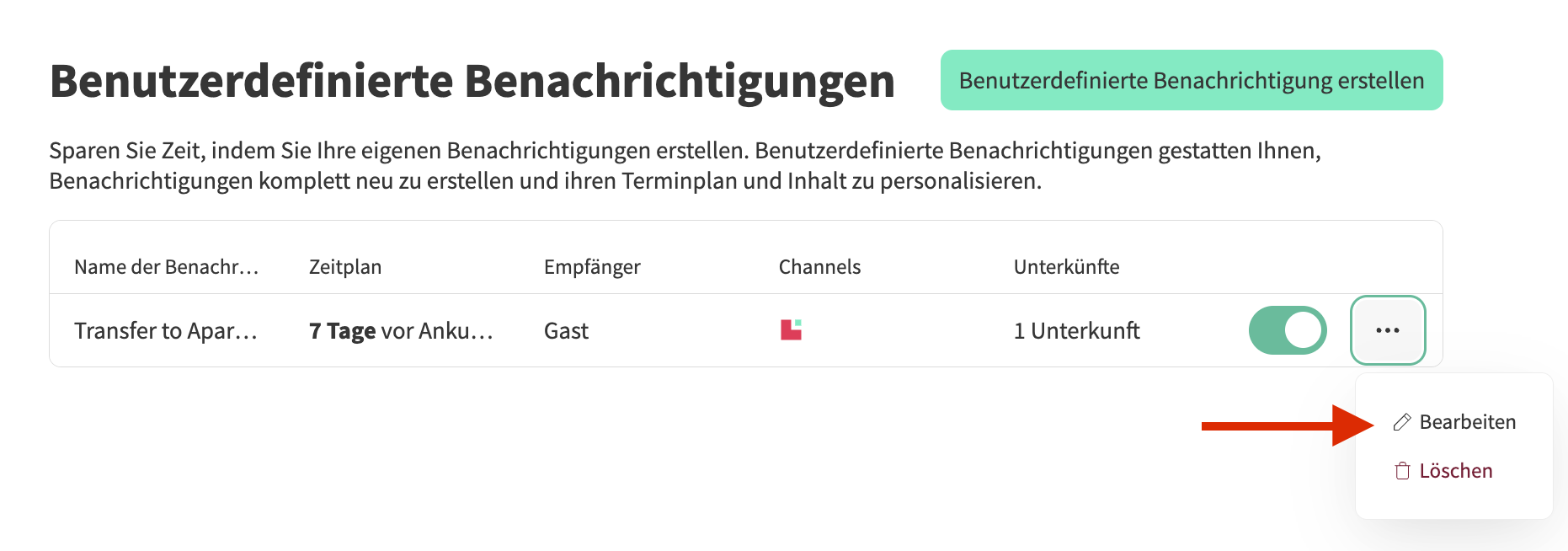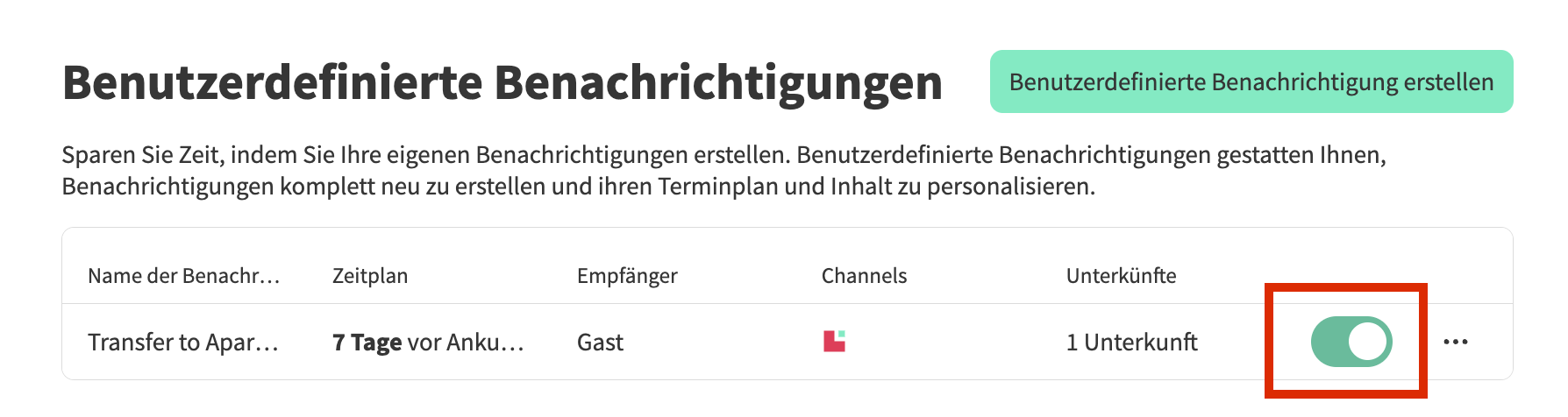 ⚠ Wichtig: Benutzerdefinierte automatische Benachrichtigungen werden immer in der Zeitzone der zugehörigen Unterkunft gesendet und können einige Minuten benötigen, bis sie zugestellt werden.