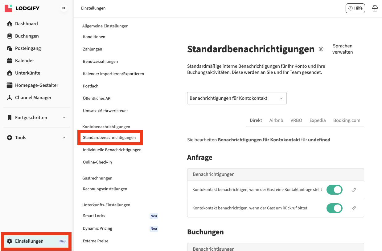 Standardbenachrichtigungen sparen Ihnen viel Zeit, um die Kontakte der Unterkunft und des Kontos auf dem Laufenden zu halten. Folgen Sie den untenstehenden Schritten, um zu erfahren, wie Sie Standardbenachrichtigungen speziell für jede Buchungsquelle einrichten und Ihre Empfängerlogik erstellen.