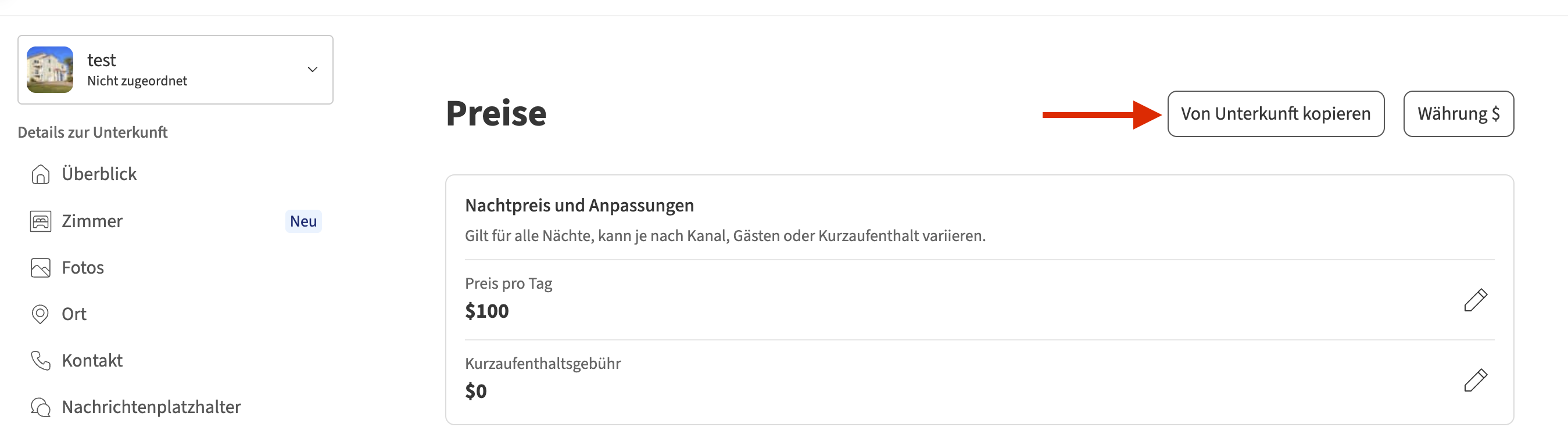 Wenn Sie Ihre Preise von Unterkunft A in Unterkunft B kopieren möchten, befolgen Sie diese Schritte: