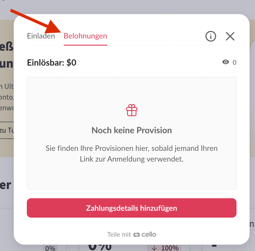 Öffnen Sie Ihr Konto-Menü unten links und klicken Sie auf Empfehlen und verdienen. - Link teilen