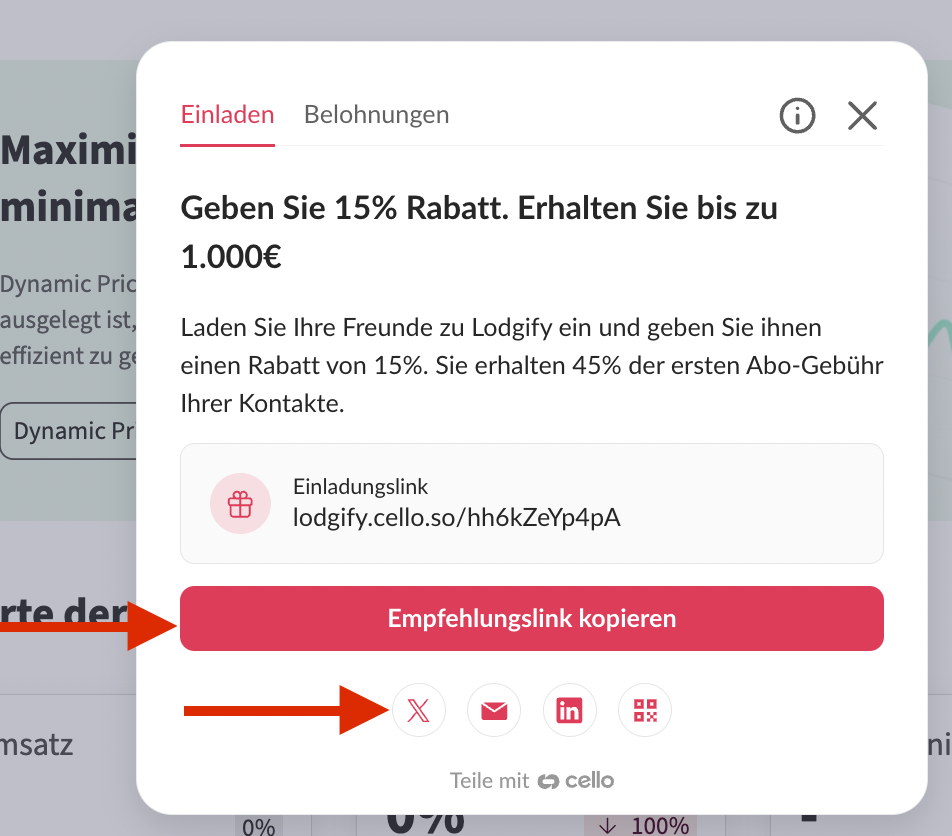 Als Lodgify-Kunde können Sie ganz einfach Freunde einladen, Lodgify zu nutzen, indem Sie Ihren persönlichen Empfehlungslink teilen – zum Beispiel in sozialen Medien, per Nachricht oder per E-Mail.