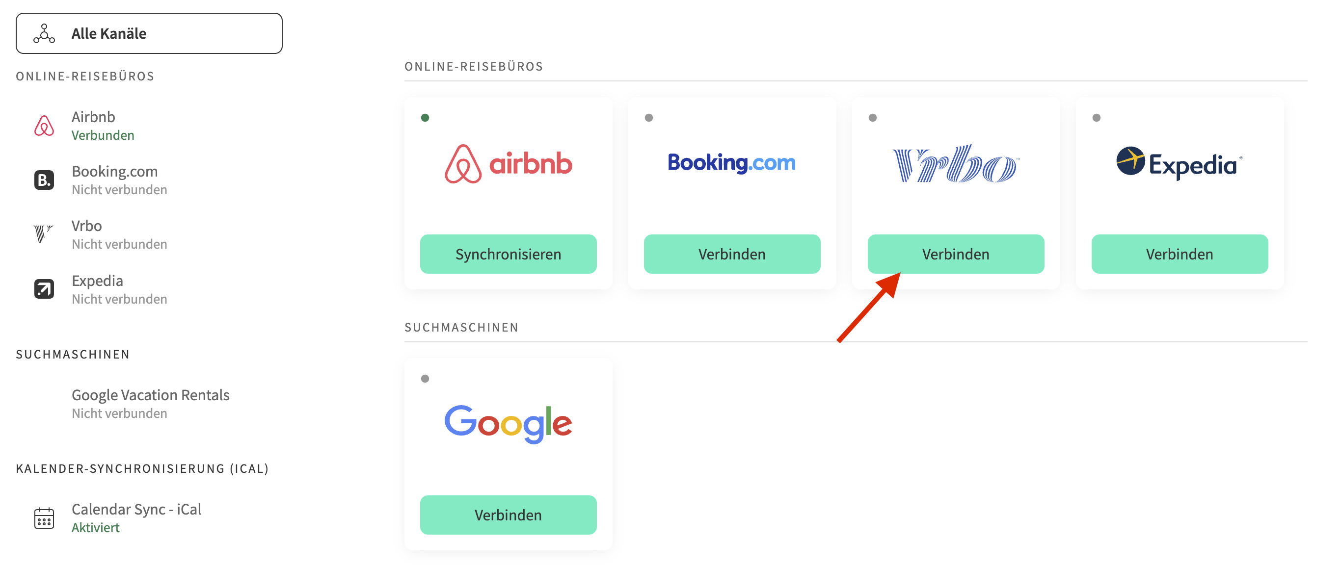 - Gehen Sie zum Bereich Channel Manager und rufen Sie die Vrbo-Verbindung auf.