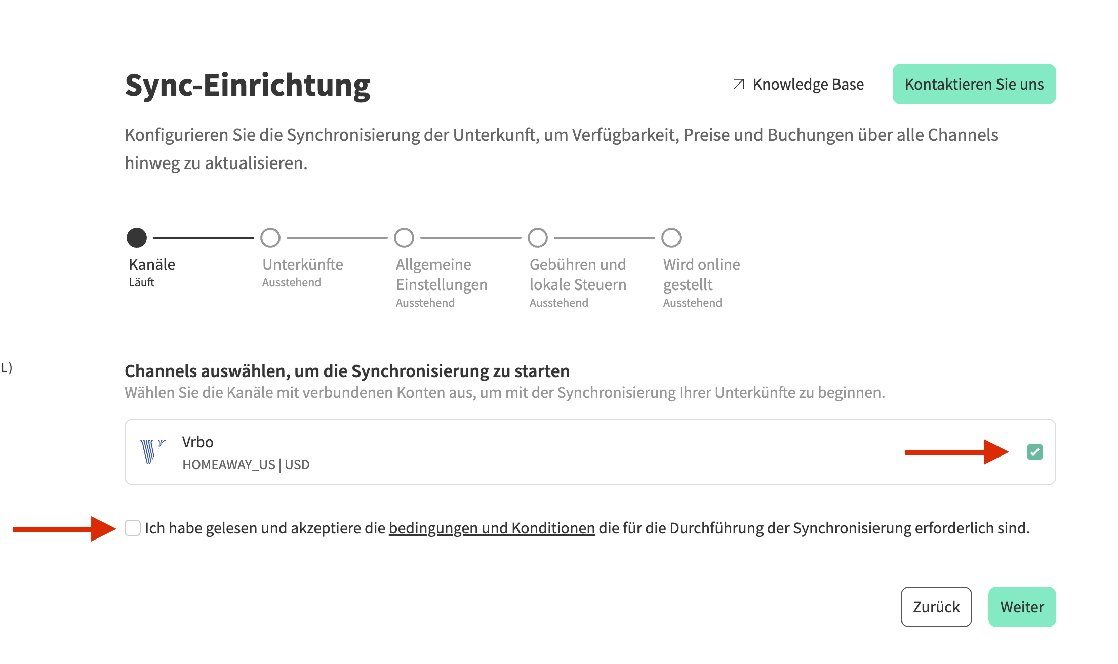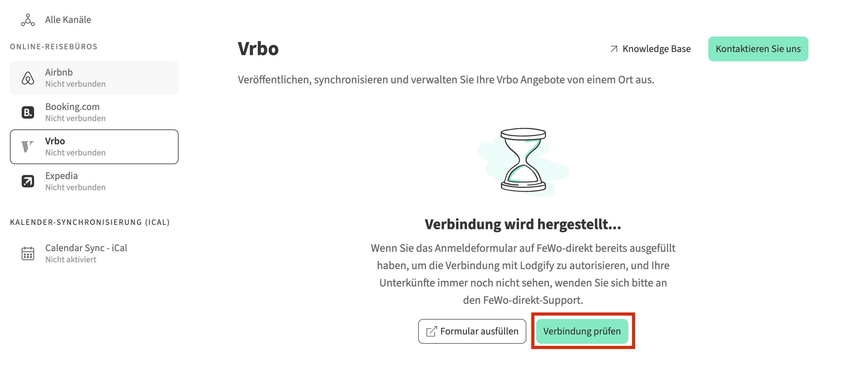 - In den meisten Fällen wird die Verbindung direkt nach dem Absenden Ihrer Informationen abgeschlossen. Es kann jedoch zu einer Verzögerung bei der Bestätigung durch Vrbo kommen. Den Status können Sie jederzeit über die Schaltfläche Verbindung prüfen überprüfen.