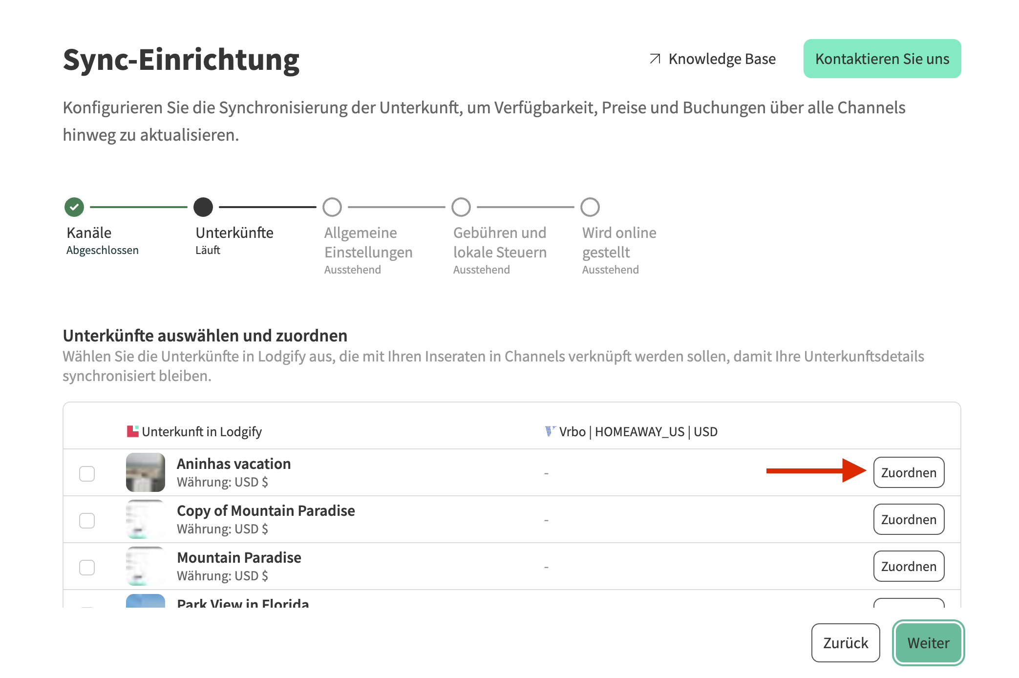 ⚠️ Wichtig: Wenn Sie ein bestehender Vrbo-Nutzer mit aktiven Inseraten sind, müssen alle Inserate zugeordnet werden. Andernfalls werden sie auf Vrbo archiviert. Falls ein nicht zugeordnetes Inserat über eine aktive Buchung verfügt, können Sie mit der Verbindung nicht fortfahren. Dies ist eine Voraussetzung von Vrbo für Drittanbieter-Software. - Wenn Sie alle gewünschten Unterkünfte zugeordnet haben, klicken Sie auf Weiter.