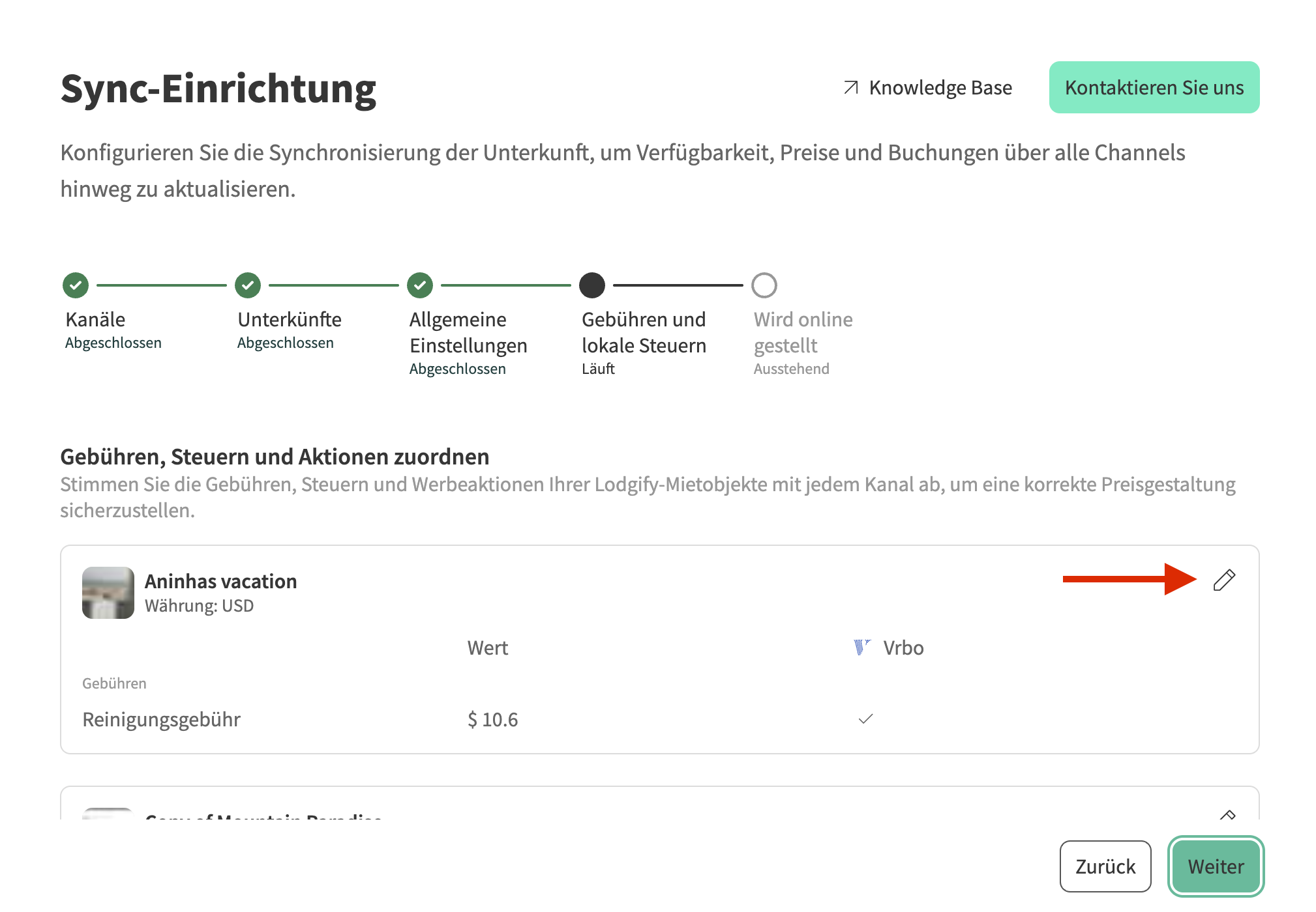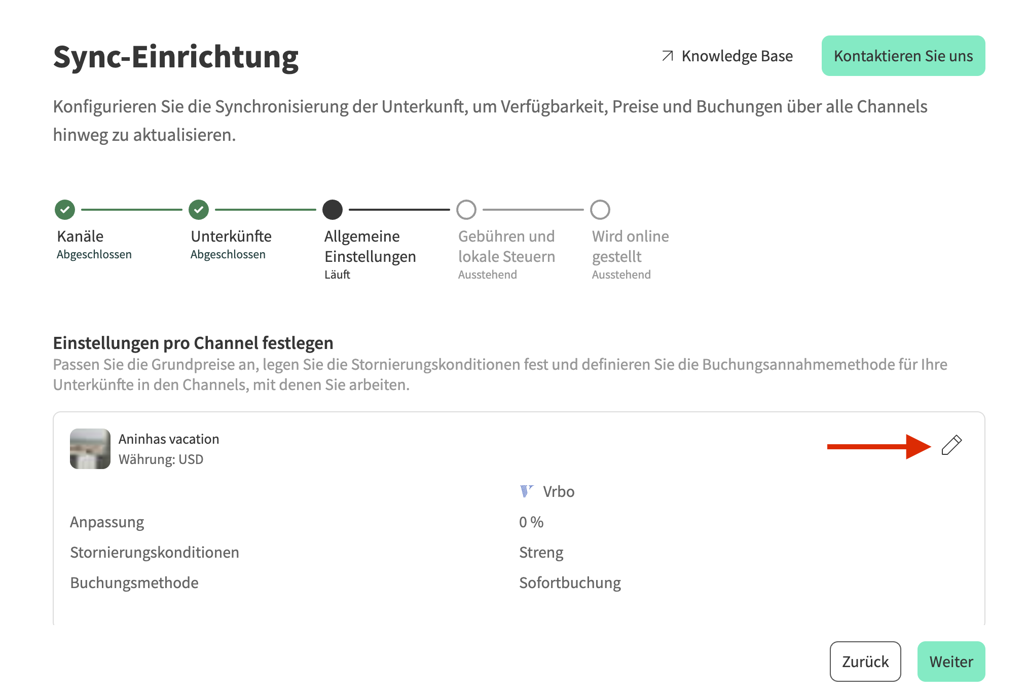 - Sie können die Vrbo-Einstellungen für jede Unterkunft anzeigen und bearbeiten, indem Sie auf das Stift-symbol und dann auf Weiter klicken.