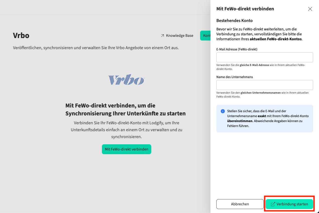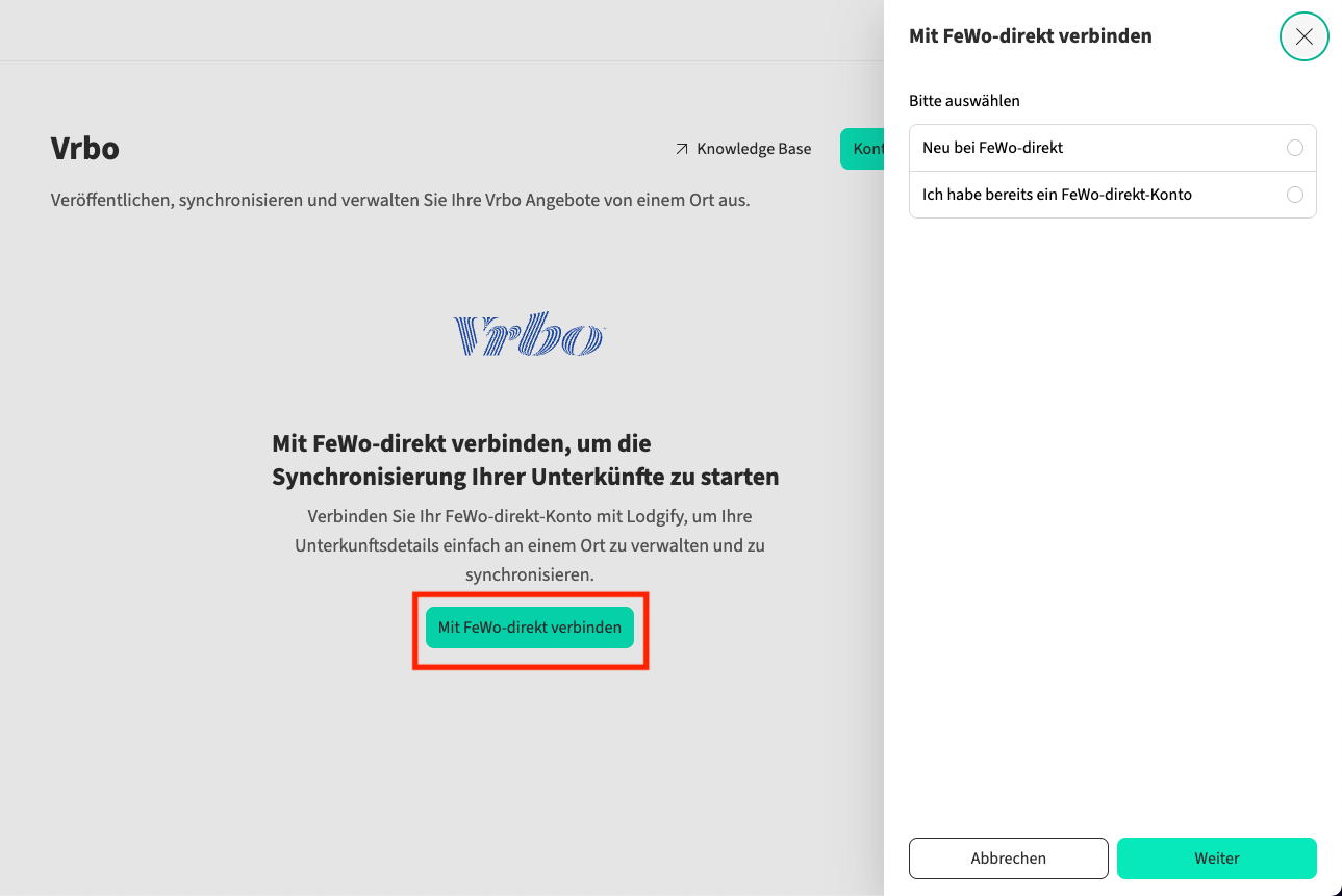 - Wählen Sie Mit FeWo-direkt verbinden verbinden und melden Sie sich anschließend bei Vrbo an oder erstellen Sie ein Vrbo-Konto.