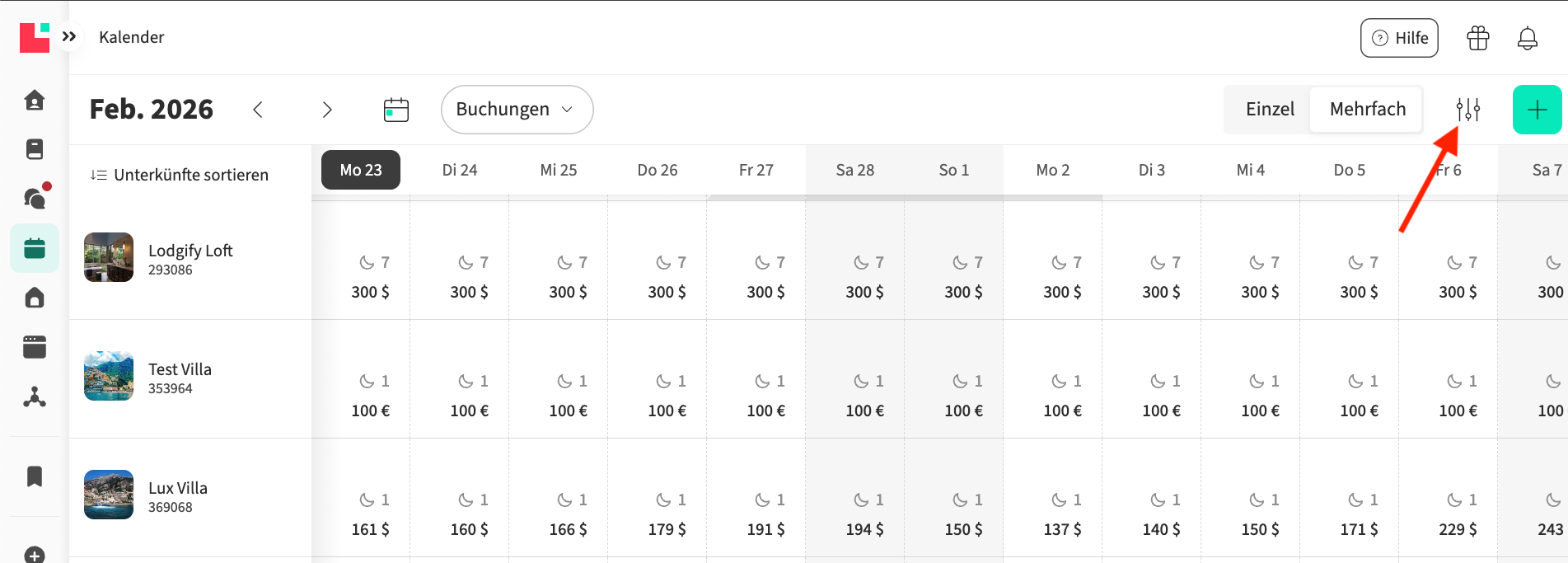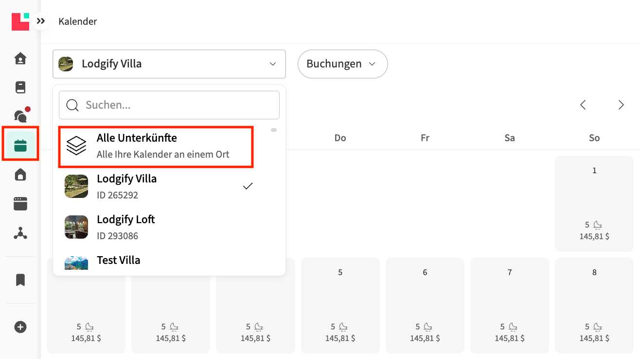 | Unterkünfte sortieren | Multi | Oben links im Kalender können Sie sortieren und auswählen, welche Unterkünfte Sie sehen möchten. Wenn Sie Unterkunftsliste anpassen auswählen, können Sie Unterkünfte ausblenden oder die Reihenfolge ändern, in der sie angezeigt werden. Diese Information wird in Ihrem Browser gespeichert. Wenn Sie also ein anderes Gerät verwenden, sind Ihre Sortiereinstellungen dort nicht sichtbar. |