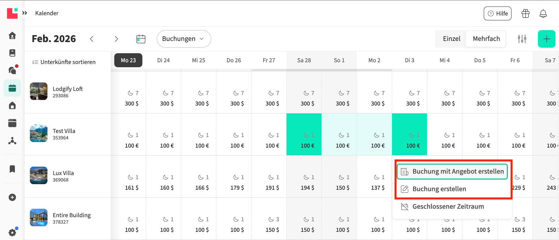 Die Einzelansicht bietet eine detaillierte Monats- oder Jahresansicht einer einzelnen Unterkunft, während die Ansicht Alle Unterkünfte eine zweiwöchige Übersicht mehrerer Unterkünfte gleichzeitig ermöglicht.