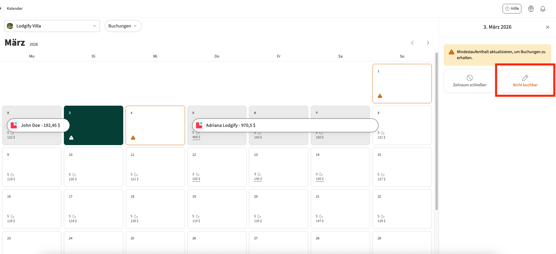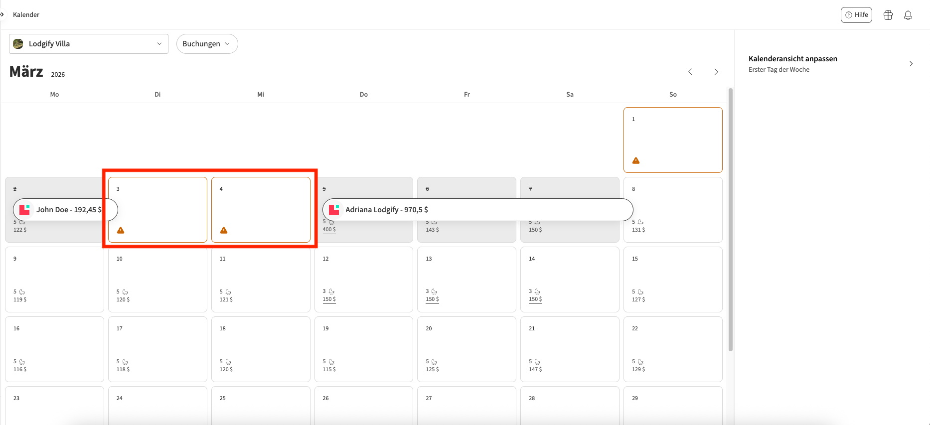 Oben rechts können Sie auswählen, ob die Woche am Montag oder Sonntag beginnen soll und ob Preise und Mindestaufenthaltsdauer für jede Nacht angezeigt werden sollen.