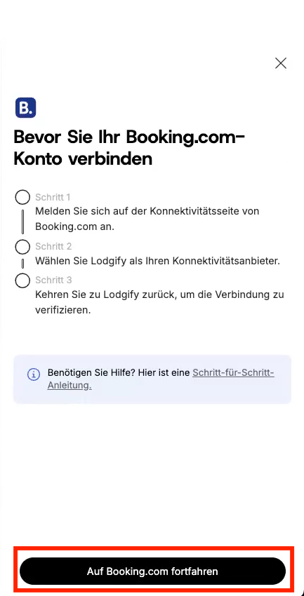 Weitere Anweisungen finden Sie in diesem Artikel: Mit Booking.com verbinden. - Kehren Sie zu Ihrem Lodgify-Konto zurück.
