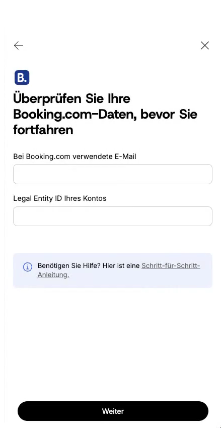 - Geben Sie Ihre Booking.com E-Mail-Adresse und die Legal Entity ID ihres Kontos ein (verfügbar in Ihrem Booking.com Extranet).