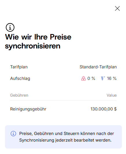 Hinweis: Ein 16 % Kanalaufschlag wird automatisch auf Ihre Unterkunftspreise auf Booking.com angewendet. Nach Abschluss der Verbindung können Sie diesen Aufschlag in den Booking.com Sync-Einstellungen bearbeiten.