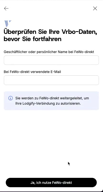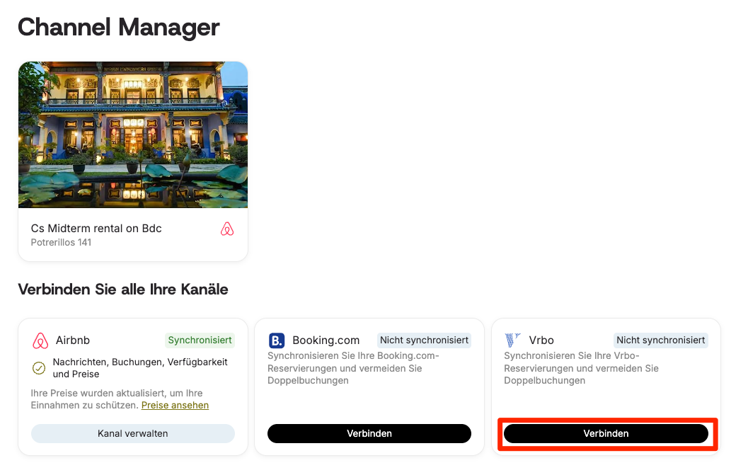 Sobald Sie die Verbindung mit Airbnb abgeschlossen haben, können Sie denselben vereinfachten Ablauf verwenden, um sich mit Vrbo zu verbinden.