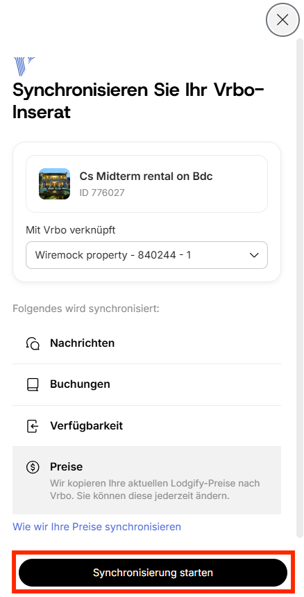 - Klicken Sie auf Synchronisierung starten, um den Zuordnungsprozess zu starten (klicken Sie auf Wie wir Ihre Preise synchronisieren, um eine vollständige Übersicht darüber zu erhalten, wie Ihre Lodgify-Preiseinstellungen synchronisiert und angewendet werden).