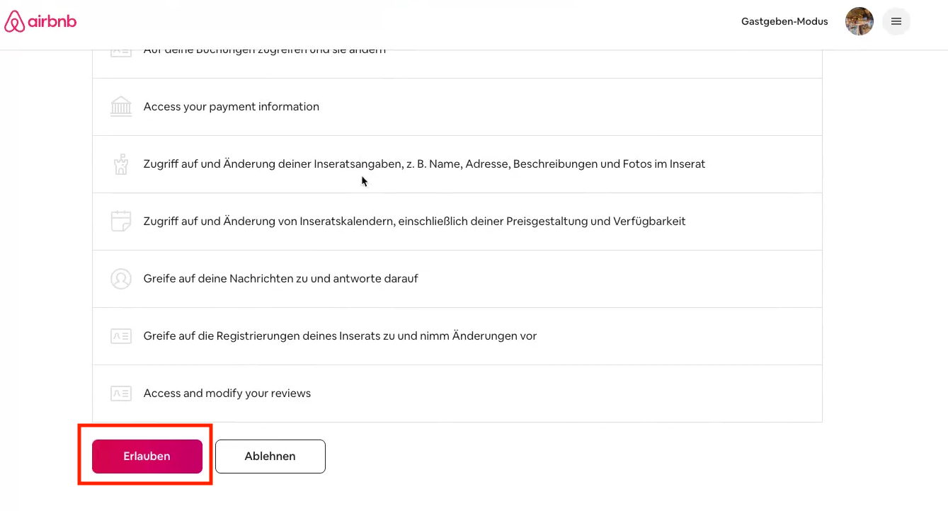 - Sie werden zu Ihrem Airbnb-Konto weitergeleitet, wo Sie Lodgify autorisieren müssen, auf die Details Ihres Airbnb-Inserats zuzugreifen. Klicken Sie auf Erlauben.