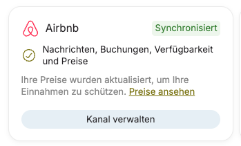 Nachdem die Verbindung abgeschlossen ist, wird Ihre Unterkunft als Synchronisiert angezeigt und Sie können auf Kanal verwalten klicken, um Ihre Airbnb-Kanal-Einstellungen zu überprüfen und zu bearbeiten.