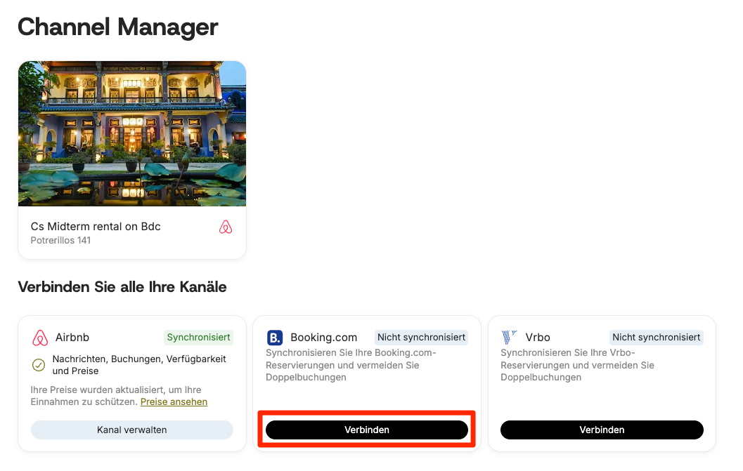 Wenn Sie nur eine Unterkunft haben, können Sie einen vereinfachten Verbindungsprozess verwenden, mit dem Sie Ihre Unterkunft in einem einzigen Vorgang mit Airbnb, Booking.com und Vrbo verbinden können.