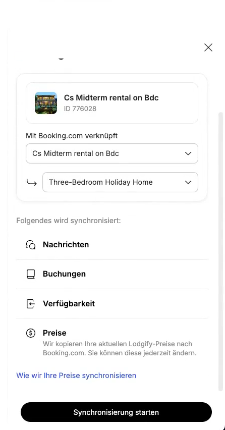 Dadurch kann Lodgify Ihre Preise, Verfügbarkeiten, Reservierungen und weitere Einstellungen mit Booking.com synchronisieren.