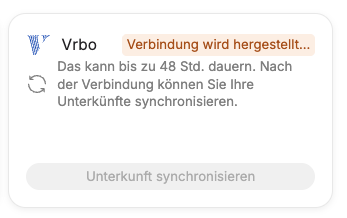 An diesem Punkt muss Vrbo die Verbindung verifizieren. Dieser Prozess kann bis zu 48 Stunden dauern. Währenddessen wird der Verbindungsstatus in Lodgify als Verbindung wird hergestellt angezeigt.