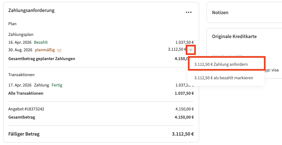 - Öffnen Sie dazu die Buchung, klicken Sie auf das „+“-Symbol neben der Zahlungszeile und wählen Sie „Zahlung anfordern“.