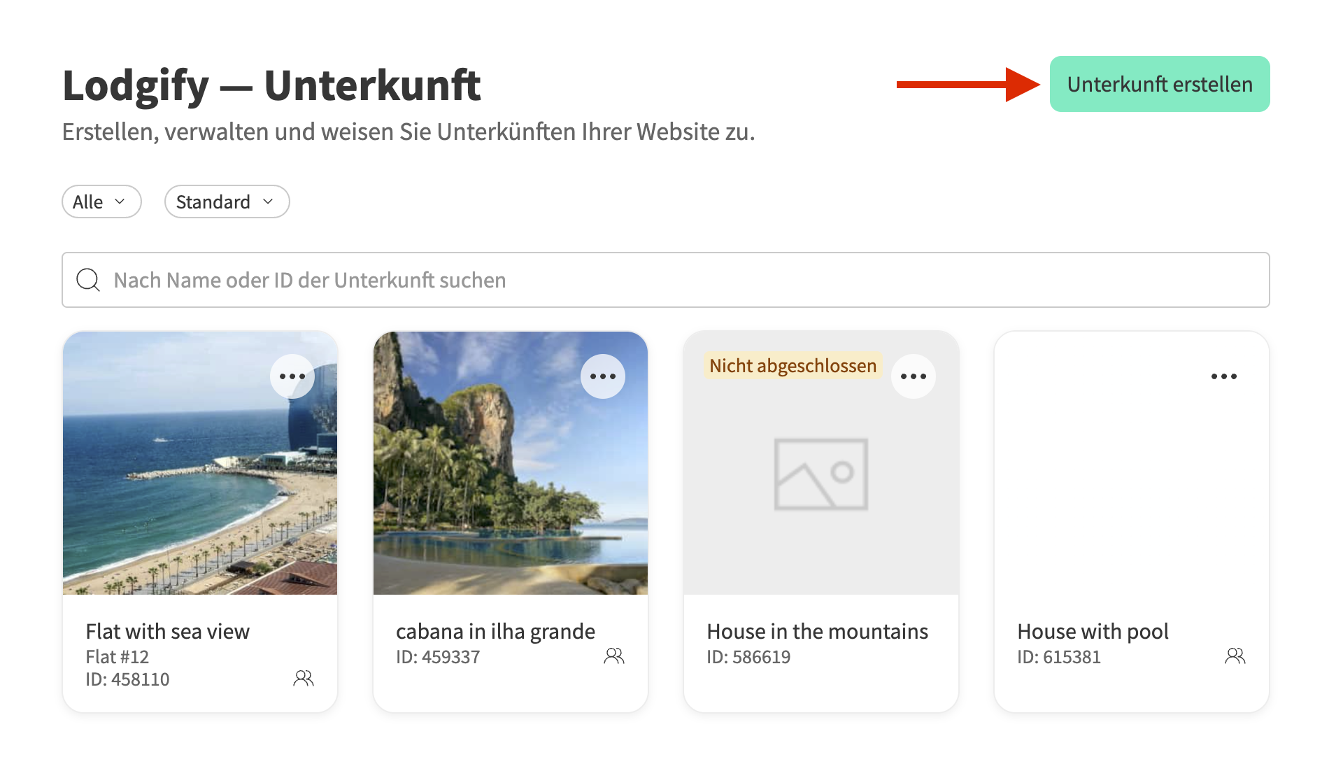 Wenn Sie eine neue Unterkunft erstellen möchten, ohne sie direkt auf Ihrer Website zu veröffentlichen, können Sie dies im Menü Unterkünfte tun. Sobald Sie die Unterkunft fertig erstellt haben, müssen Sie sie Ihrer Website zuweisen. Falls Sie ggf. mehr als eine Website haben, müssen Sie sie der richtigen Website zuweisen.