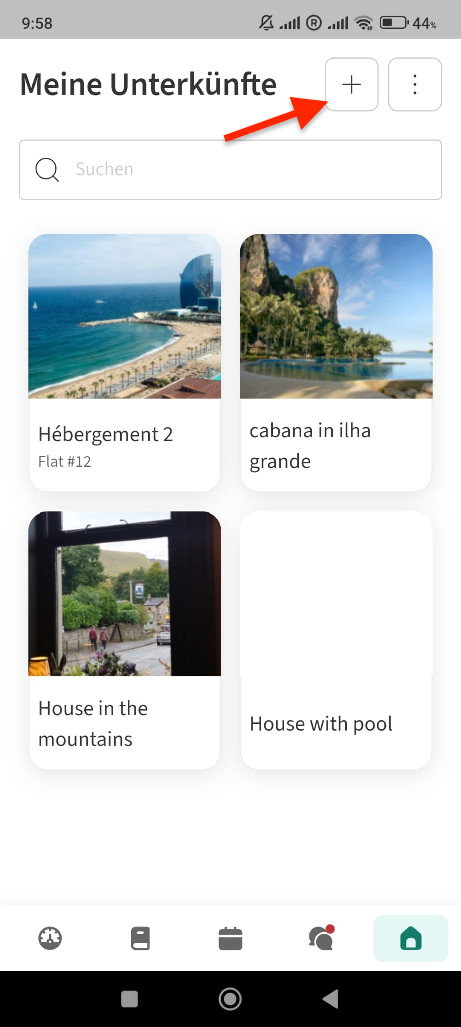 2. Klicken Sie dann auf Unterkunft erstellen.📱 Sie können dies auch in der mobilen App tun, indem Sie zum Bereich Unterkünfte gehen und oben rechts auf das + Symbol tippen: