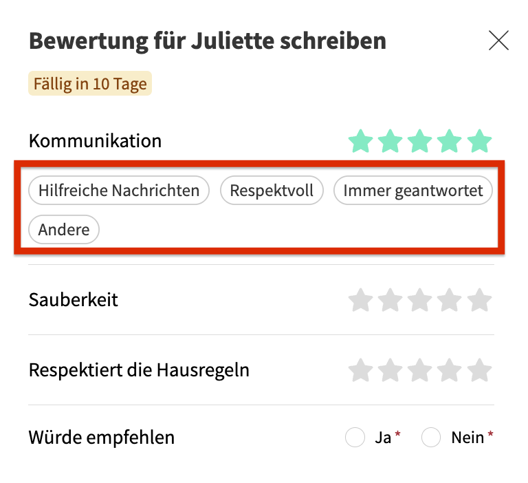 Beim Schreiben von Bewertungen können sowohl Sie als auch Ihre Gäste spezifische Tags verwenden, um positive oder negative Aspekte des Aufenthalts hervorzuheben, wie Sauberkeit, Kommunikation oder die Einhaltung der Hausregeln. Diese Tags helfen Ihnen, Bereiche zu identifizieren, die möglicherweise verbessert werden müssen, oder Bereiche, in denen Sie hervorragende Leistungen erbringen, was zu besseren Gästeerfahrungen, verbesserten Bewertungen und potenziell höheren Buchungsraten führt. Sowohl Gastgeber als auch Gäste können die Tags sehen, die den Bewertungen auf Airbnb zugeordnet sind.
