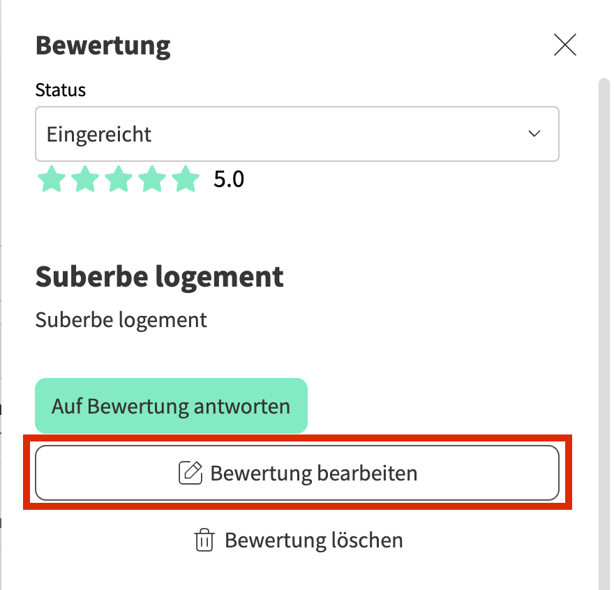 Wenn ein Gast eine Bewertung auf Ihrer Website hinterlässt, werden Sie per E-Mail darüber benachrichtigt. Sie können wählen, ob Sie die Bewertung akzeptieren oder ablehnen möchten, sowie ihre Details bearbeiten und dem Gast antworten. Nur wenn eine Bewertung akzeptiert wurde, wird sie auf Ihrer Website angezeigt.