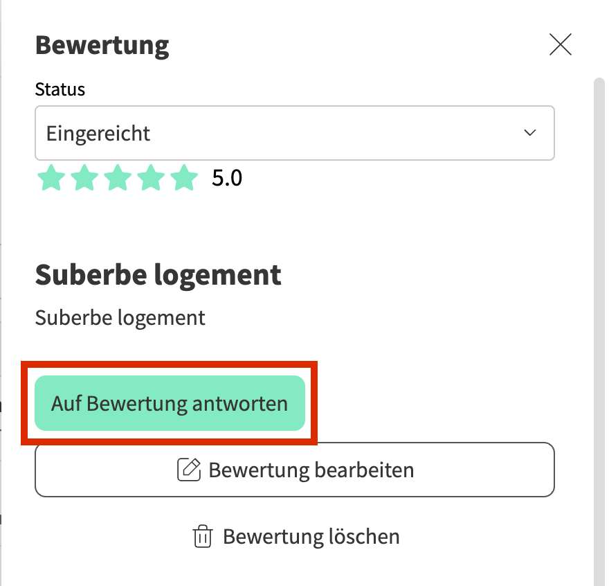 Auf Bewertung antworten 💡 Hinweis:Antworten auf Bewertungen sind eine gute Gelegenheit, Gästen Ihr Engagement zu zeigen! |
